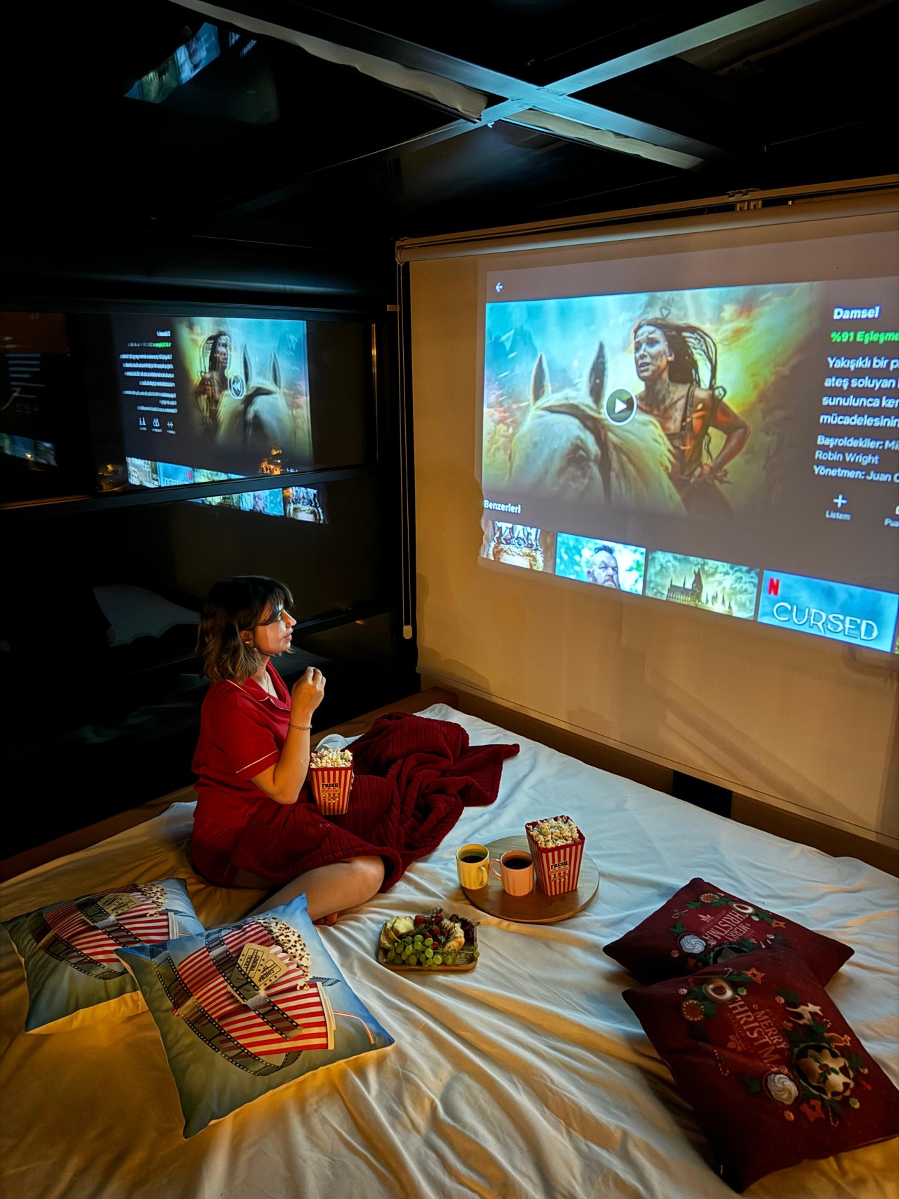 Kule içinde özel yapım yatak ve özel tasarlanmış projektör ile sinema odası tasarlanmıştır. Sinema keyfini yaşamanız için patlamış mısır yapabileceğiniz makine verilecektir